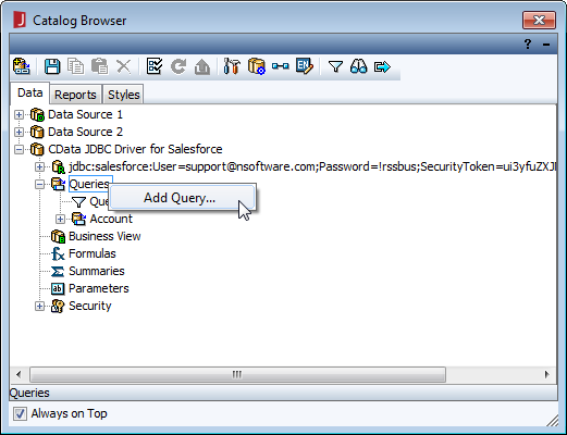 - Catalog Browser で、レポートを作成するためのクエリを作成できます。これはレポート作成前でも作成後でも行えます。データソース(CData JDBC Driver for Adobe Target)を展開()し、Queries を右クリックして Add Query を選択します。