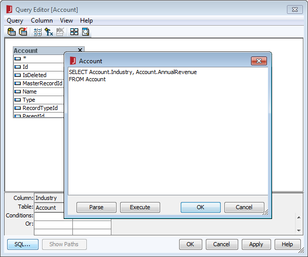 - Query Editor ダイアログで、含めるカラムを選択するか、SQL ボタンをクリックして独自のクエリを手動で入力します。例えば次のようになります。