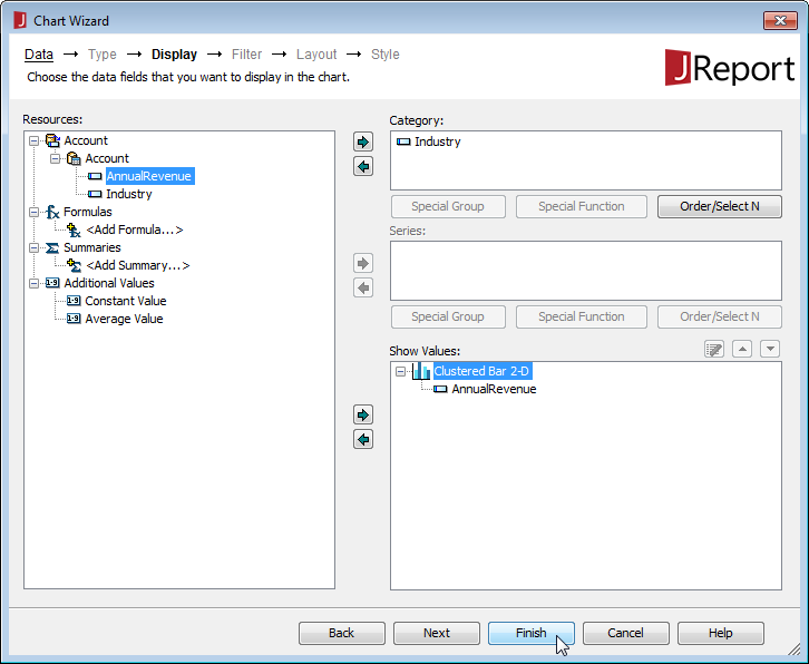 - クエリのカラムからチャートの Category と Value を設定し、Finish をクリックします。
