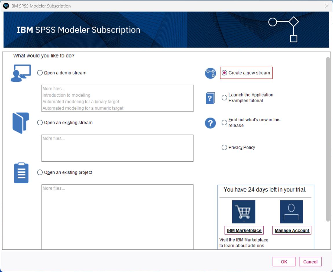 - IBM SPSS Modeler を起動し、ログインして新しいストリームを作成します。