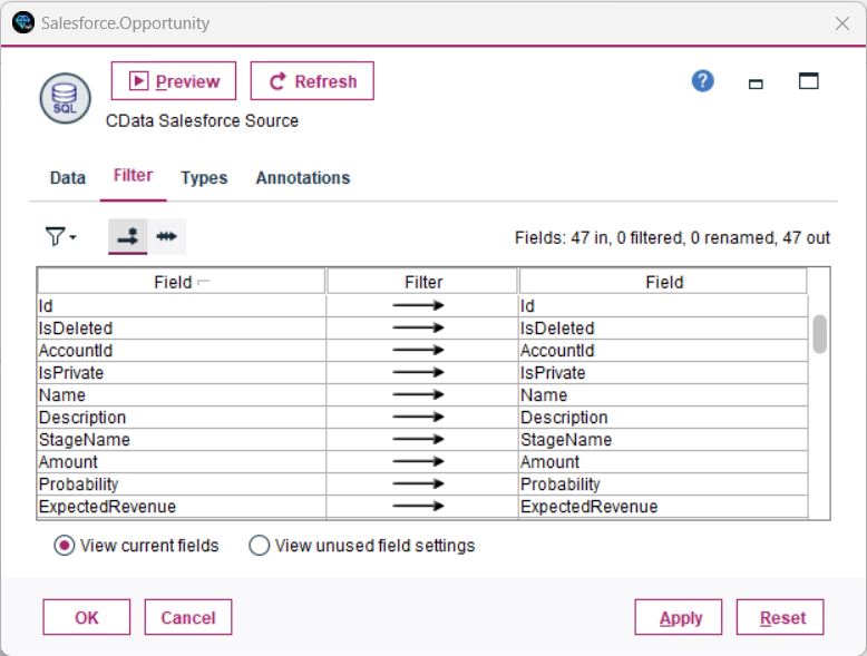 - フィルタリング:Database 接続をダブルクリックし、Filter セクションでフィールドを選択/解除して、関連するデータに絞り込みます。これにより処理速度とモデル精度が向上します。