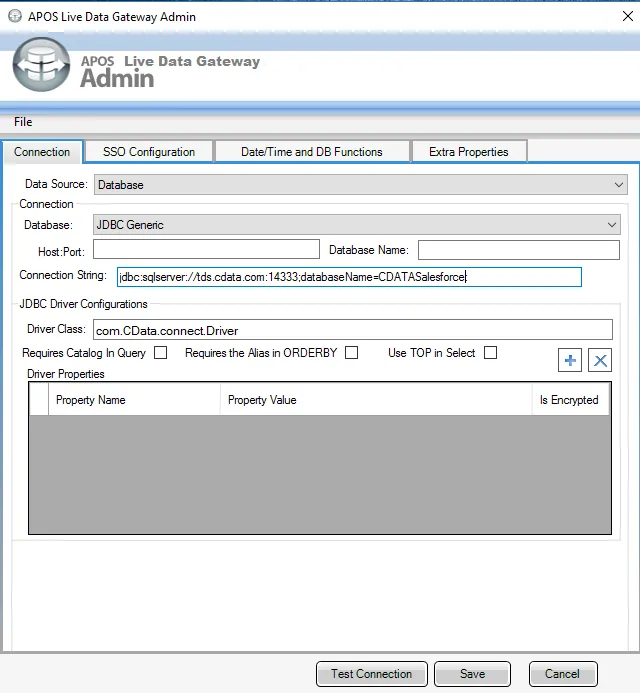 - APOS Live Data Gateway の「Connection」タブで接続を設定します。