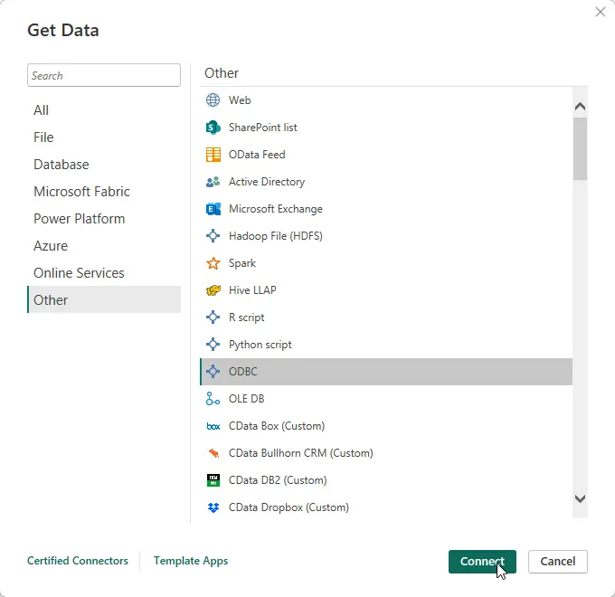 [データを取得] ウィンドウで その他 -> ODBC を選択します。