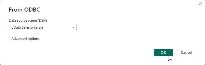 メニューから DSN を選択します。データをインポートするための SQL クエリがわかっている場合は、[詳細オプション] ノードを展開し、[SQL ステートメント]ボックスにクエリを入力できます。それ以外の場合は OK をクリックして続行します。