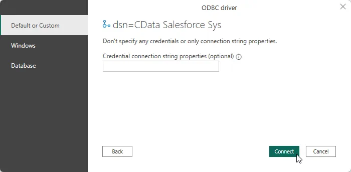 まだ設定していない場合は、ODBC DSN(データソース名)で接続プロパティを指定します。これはドライバーインストールの最後のステップです。Microsoft ODBC データソースアドミニストレーターを使用して、ODBC DSN を作成・設定できます。