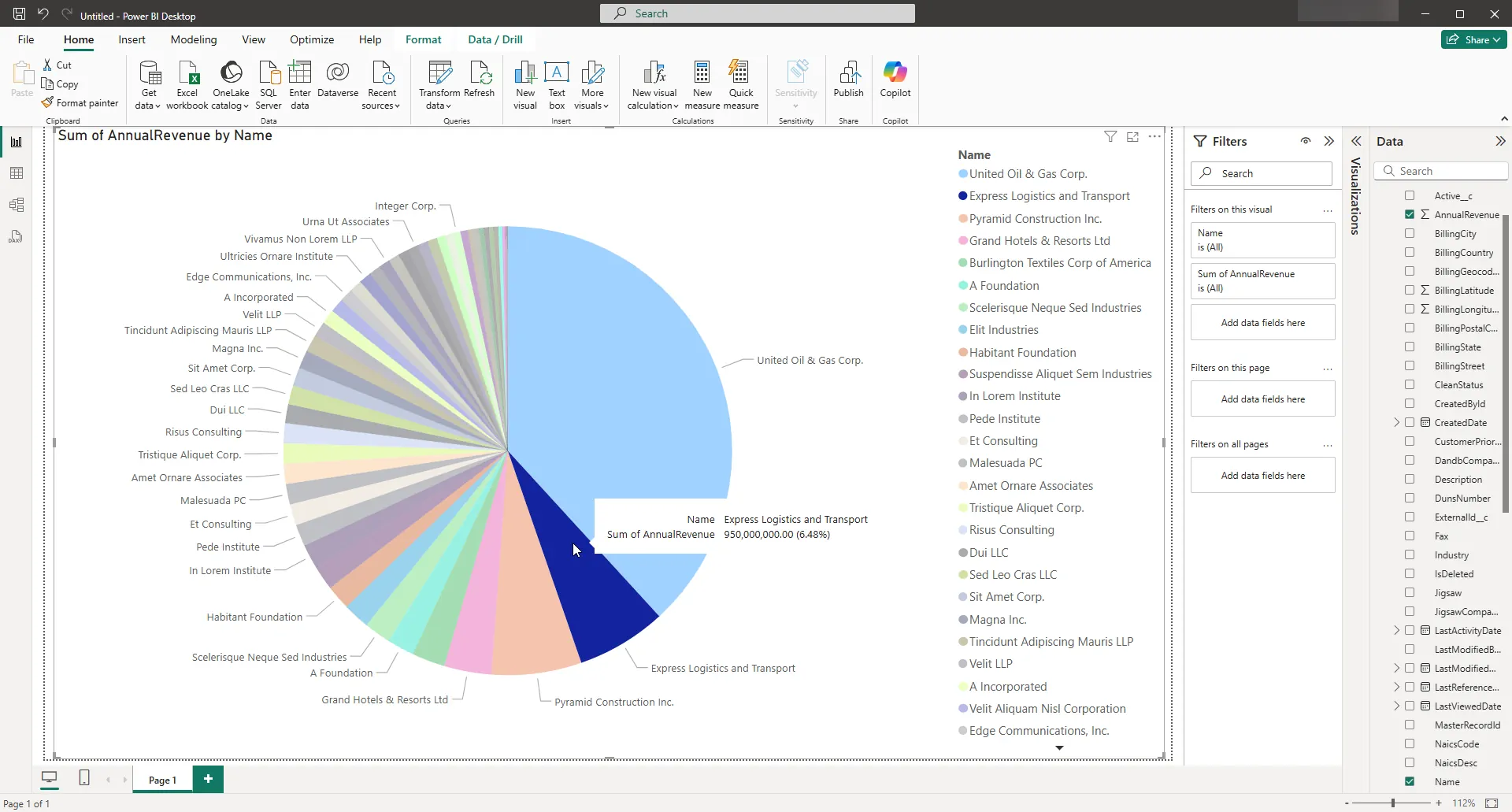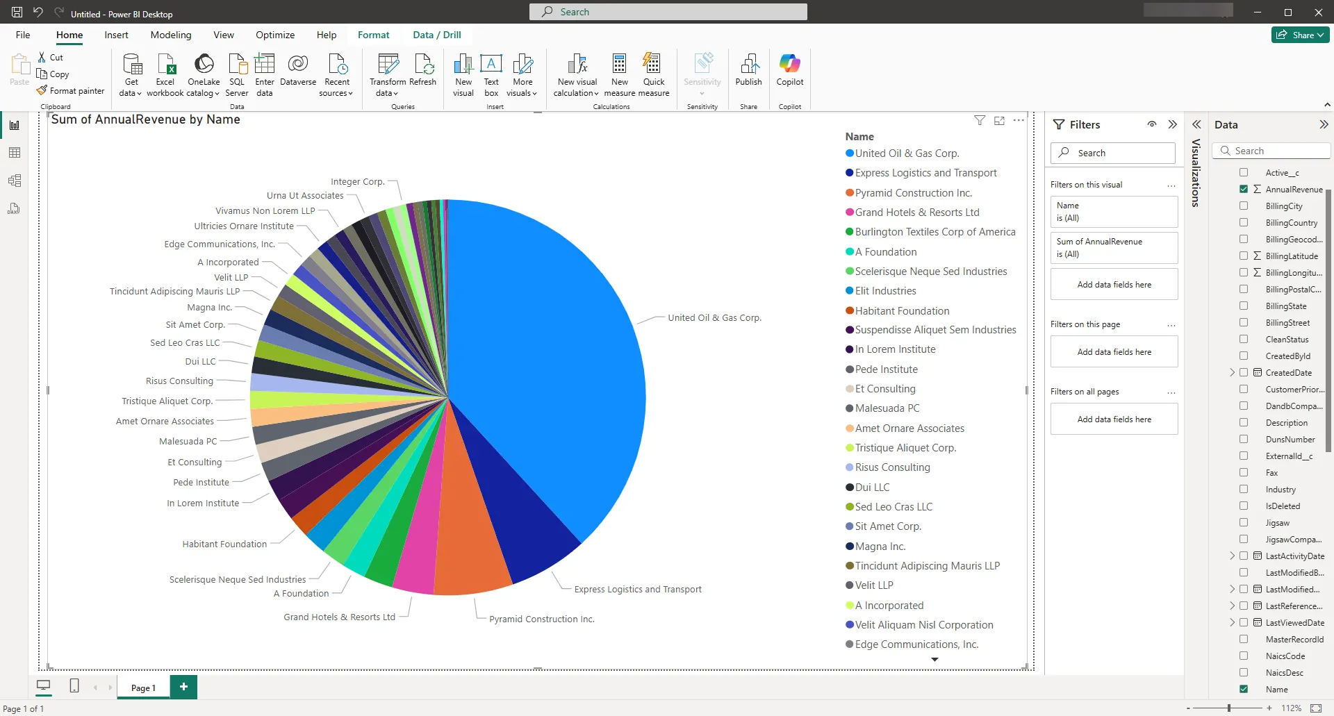 データを Power BI に取り込んだら、[フィールド] ペインからキャンバスにフィールドをドラッグして、[レポート] ビューでデータビジュアライゼーションを作成できます。以下の手順で円グラフを作成してみましょう(Salesforce の例)。