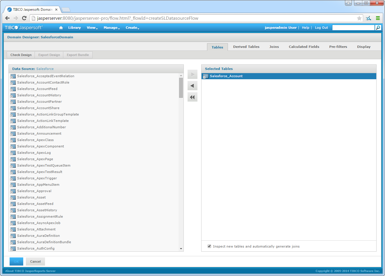 - Tables タブで、Data Source ペインからテーブルを選択し、矢印をクリックして Selected Tables ペインに追加します。