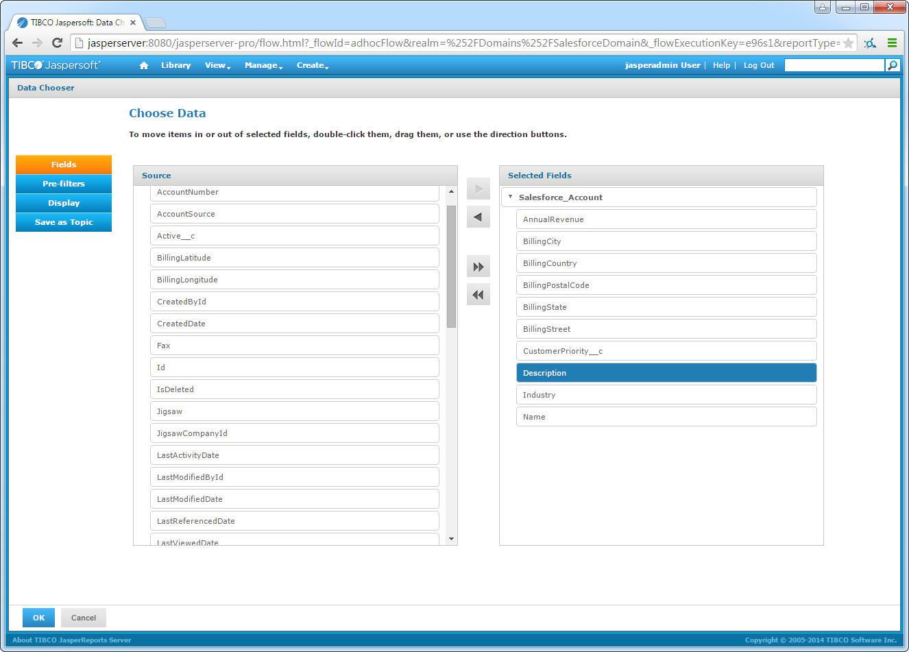 Choose Data ページで、ビューで使用するカラムを選択します。Pre-Filters セクションでは、選択したフィールドに基づいてフィルタを作成できます。Display セクションでは、ドメインで表示されるカラム情報を変更できます。