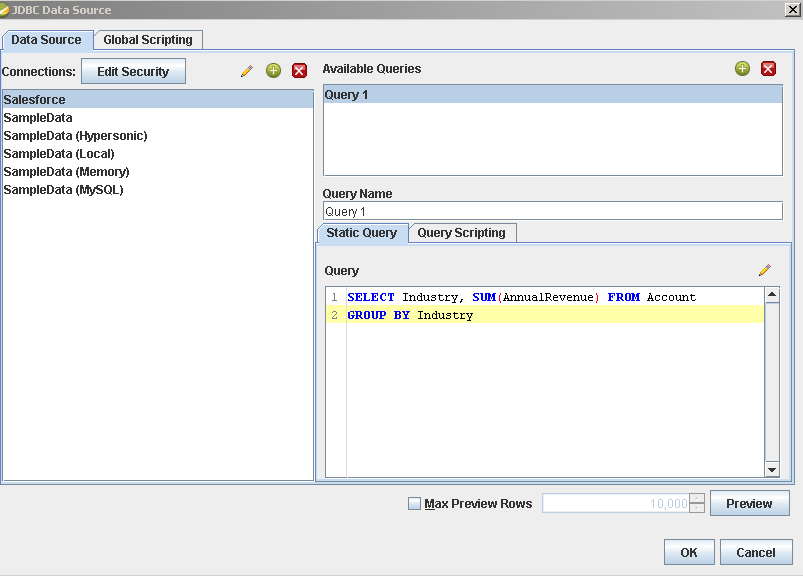 JDBC URL を設定する際、Max Rows 接続プロパティの設定も検討してください。これにより返される行数が制限されます。特にレポートやビジュアライゼーションを設計する際のパフォーマンス向上に役立ちます。