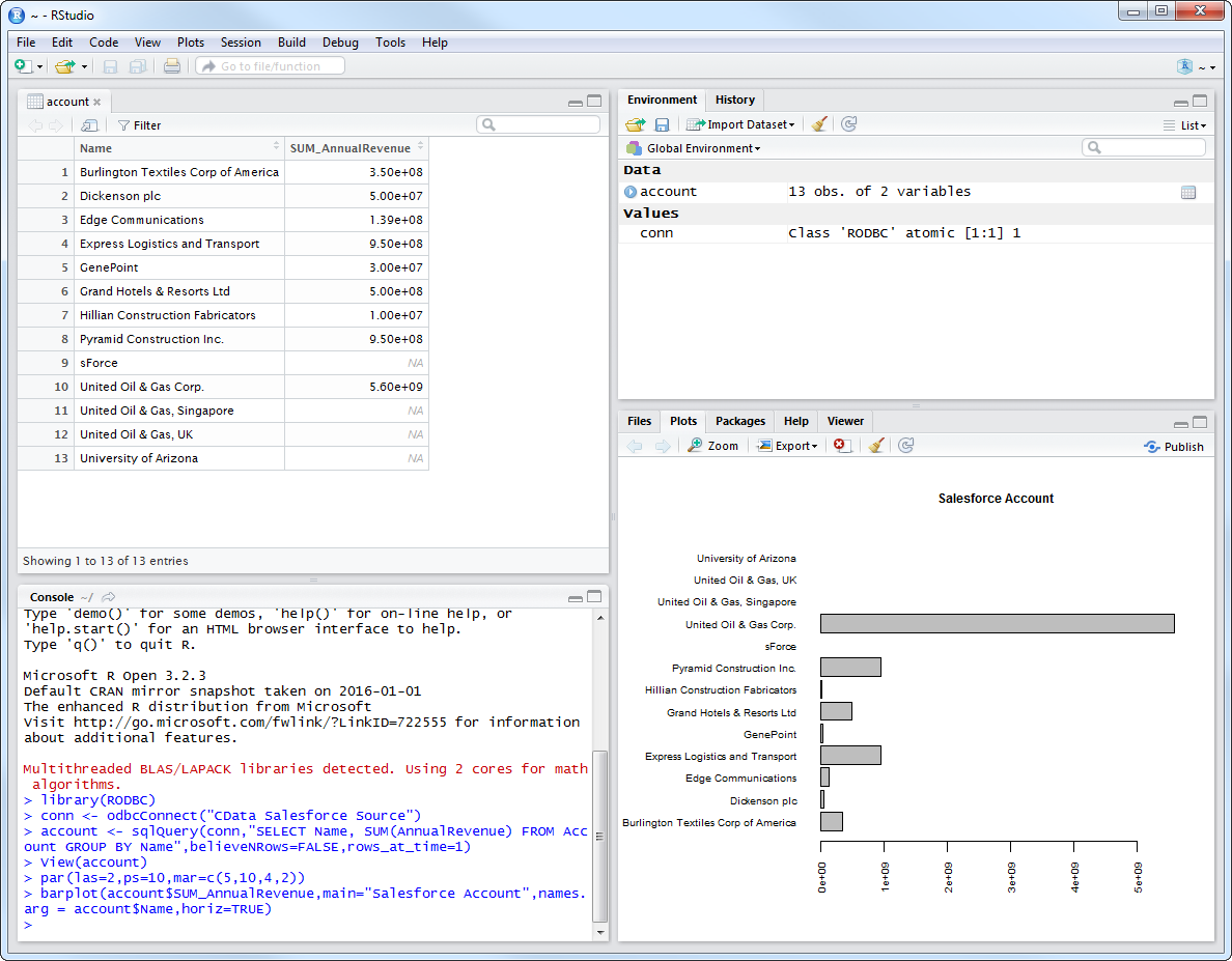 純粋な R スクリプトと標準 SQL で Basecamp のデータ にアクセスできます。CData ODBC ドライバ for Basecamp と RODBC パッケージを使用すると、R からリモート Basecamp のデータ を操作できます。CData ドライバを使用することで、業界で実績のある標準に準拠したドライバを活用し、人気のオープンソース言語 R でデータにアクセスできます。この記事では、ドライバを使用して Basecamp のデータ に SQL クエリを実行し、R で Basecamp のデータ を可視化する方法を説明します。