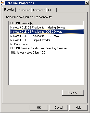 - Data Link Properties ウィンドウの Provider タブで、Microsoft OLE DB Provider for ODBC Drivers を選択します。