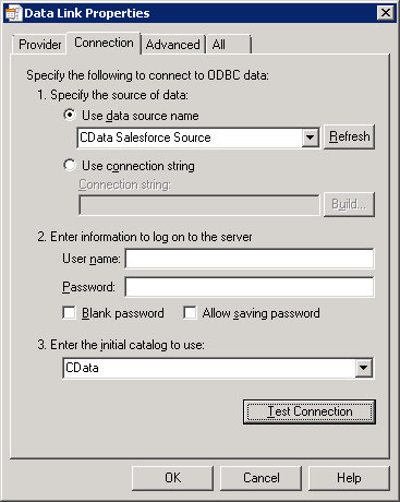 - Connection タブで、Data Source Name と使用する初期カタログ(CData)を選択します。