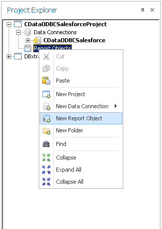 - プロジェクト内の Report Objects を右クリックし、New Report Object を選択します。
