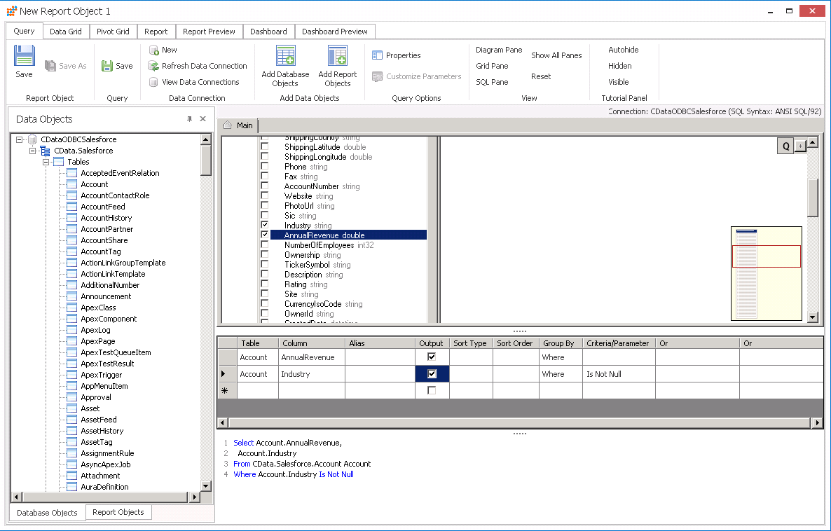 - Query タブで、接続オブジェクトを展開し、ダッシュボードに含めたいテーブル、ビュー、特定のカラムを選択します。検索条件を指定したり、JOIN や集計を含む複雑なクエリを作成することもできます。