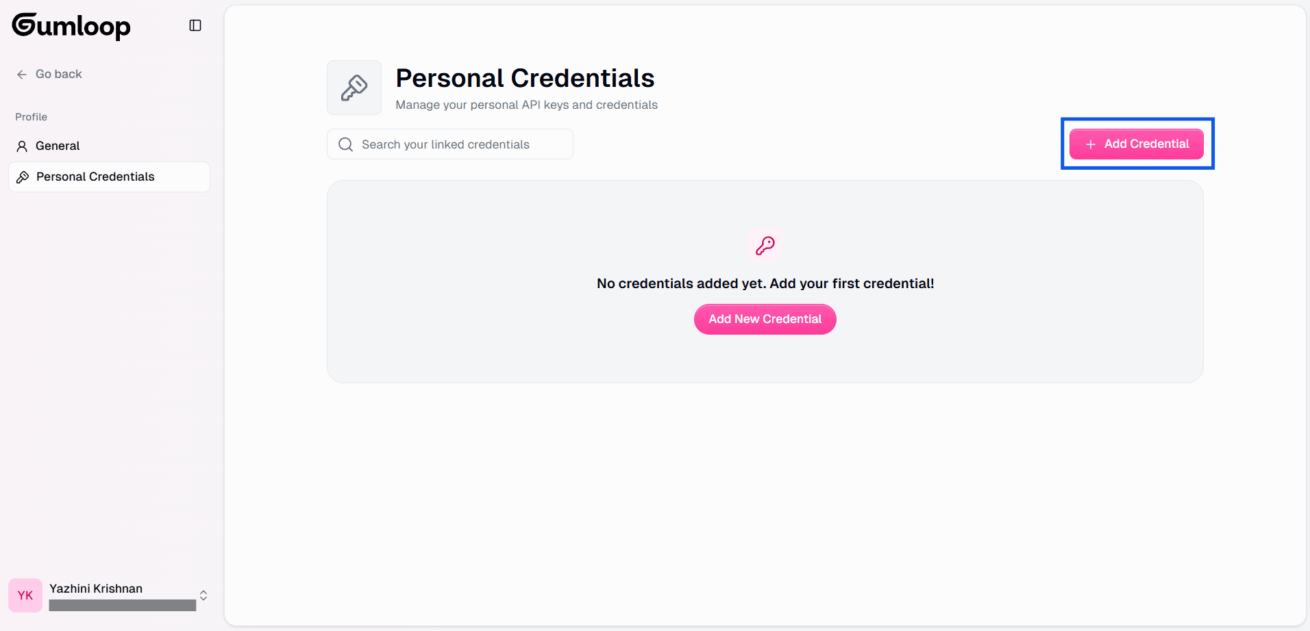 - Gumloop Credentials のページにアクセスして、MCP Server を構成します。