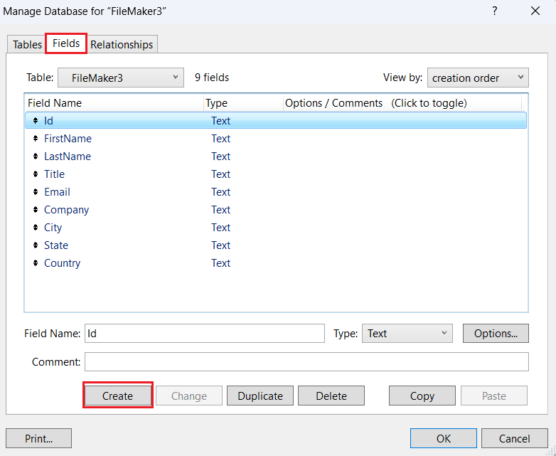 - Fields タブで、テーブルで使用するフィールドを作成・追加します。