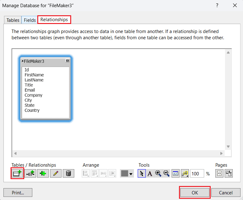 - Relationships タブで、複数のテーブルがある場合はテーブルのリレーションシップを追加し、OK をクリックします。