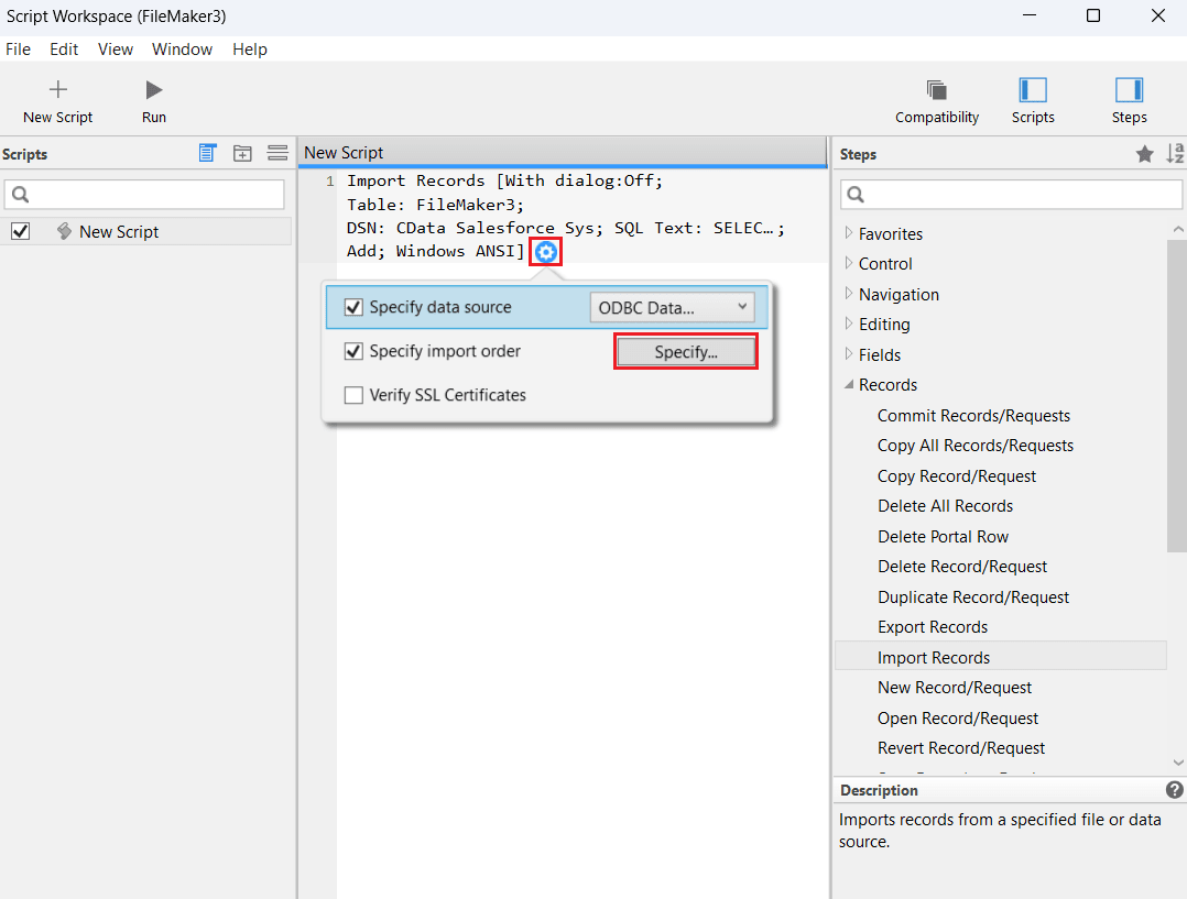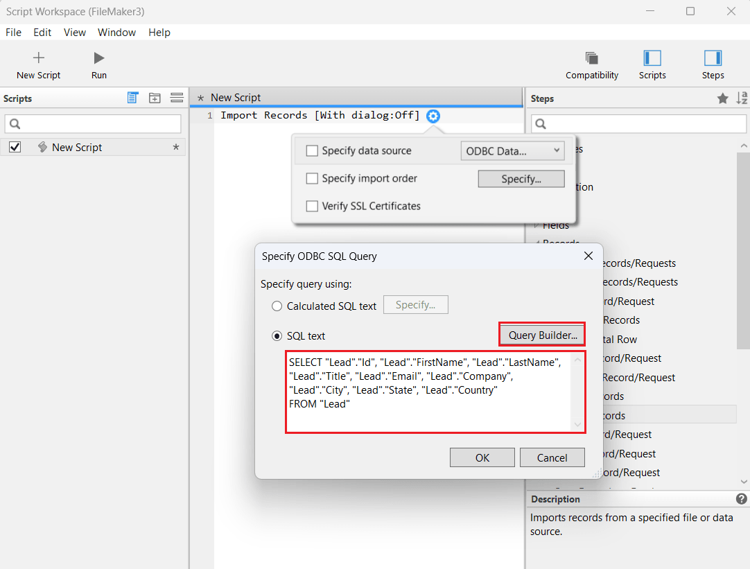 - 右側の Steps パネルから Records > Import Records > Insert into Script を選択します。