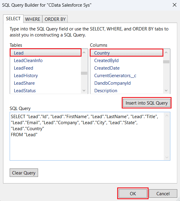 - あるいは、Query Builder を選択して SQL Query Builder ウィンドウを開きます。Tables セクションから対象テーブルを選択し、Columns セクションから関連するカラムを選択します。各選択後に Insert into SQL Query をクリックしてクエリを自動生成します。WHERE や ORDER BY 句、または専用のタブを使用してクエリを手動で編集することもできます。OK をクリックしてクエリを確定します。
