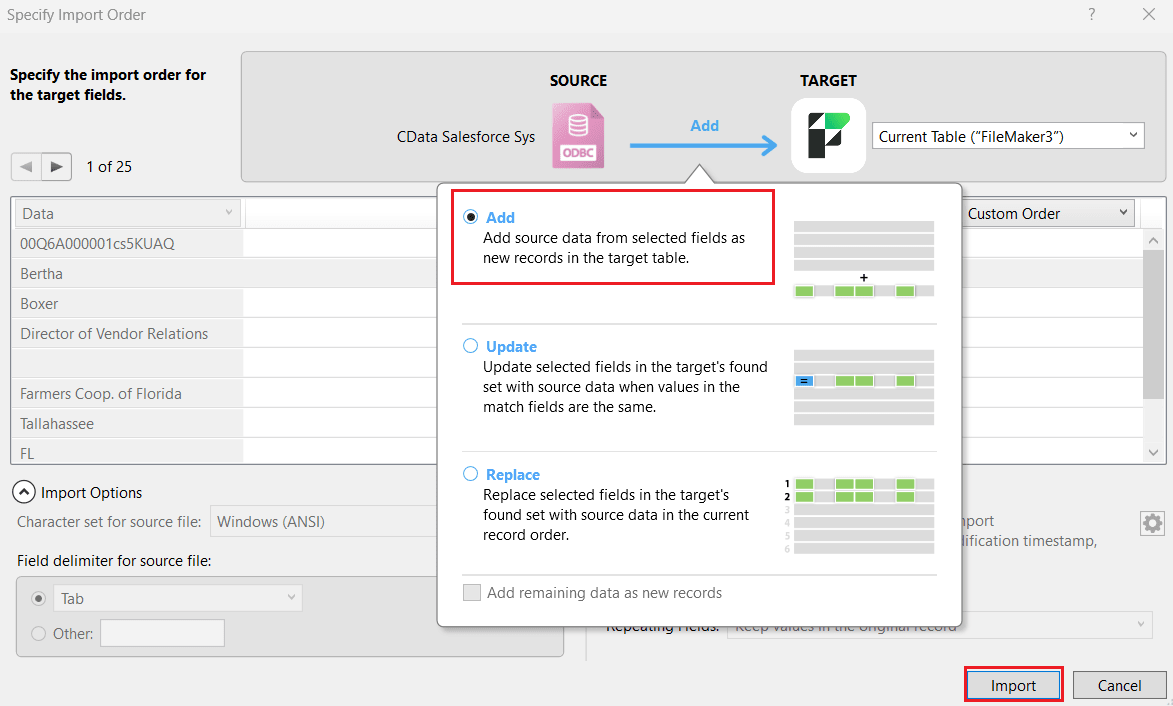 - Specify Import Order ウィンドウで、先ほど追加したターゲットフィールドのインポート順序を定義します。ソースフィールドとターゲットフィールドの間で Add を選択して、Couchbase のデータを新しいレコードとしてテーブルに挿入します。Import をクリックします。