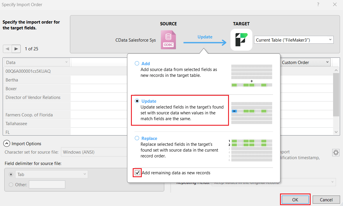- Specify Import Order ウィンドウで、ソースとターゲットの間で Update を選択して、インポート済みのCouchbase データを更新します。これにより、マッチフィールドの値が同じ場合に、選択したフィールドのCouchbase データ値でターゲットの検索セットが更新されます。マッピングで少なくとも1つのマッチフィールドを定義し、Add remaining data as new records チェックボックスを選択する必要があります。Import をクリックします。