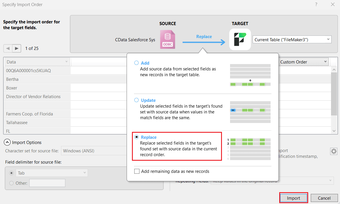 - あるいは、ユースケースに応じて Update の代わりに Replace オプションを選択します。これにより、ターゲットの検索セット内の選択したフィールドが、現在のレコード順序でCouchbase のデータに置換されます。Import をクリックします。