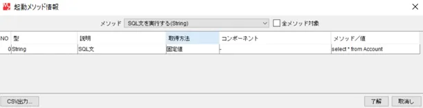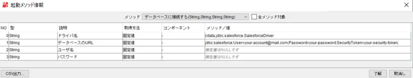 ・データベースのURL:<事前に確認した接続文字列を指定します。> 事前に確認した接続文字列を指定します。> - データを取得する際にはデータベースアクセスコンポーネントの「SQLを実行する」メソッドを利用してSQL を実行します。