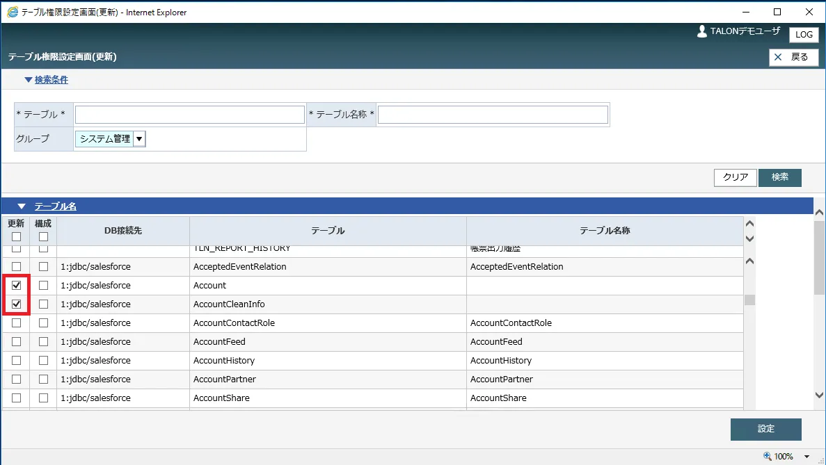 TALONにログイン後、メニュー→機能構築→テーブル更新権限設定画面で、扱いたいテーブルに対して更新権限を与えます。