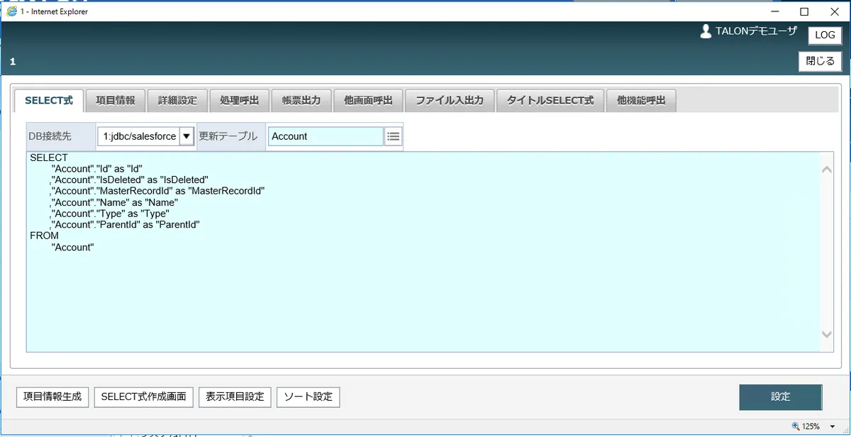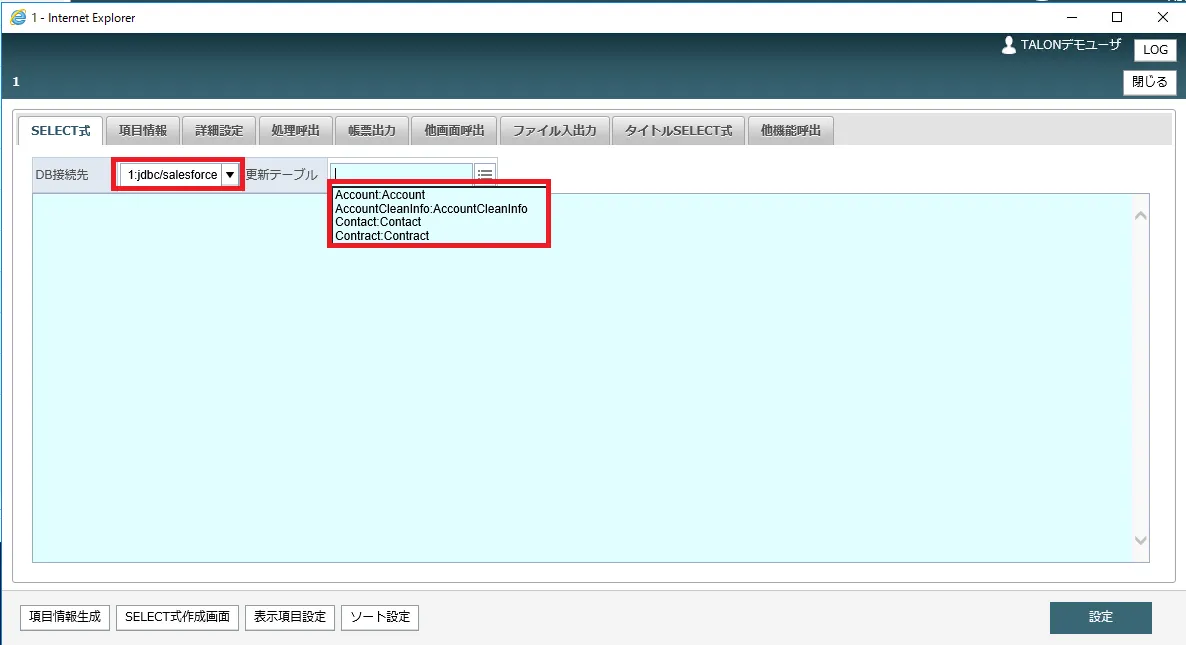 SELECT式作成画面でも権限を与えたテーブルが選べるようになっています。