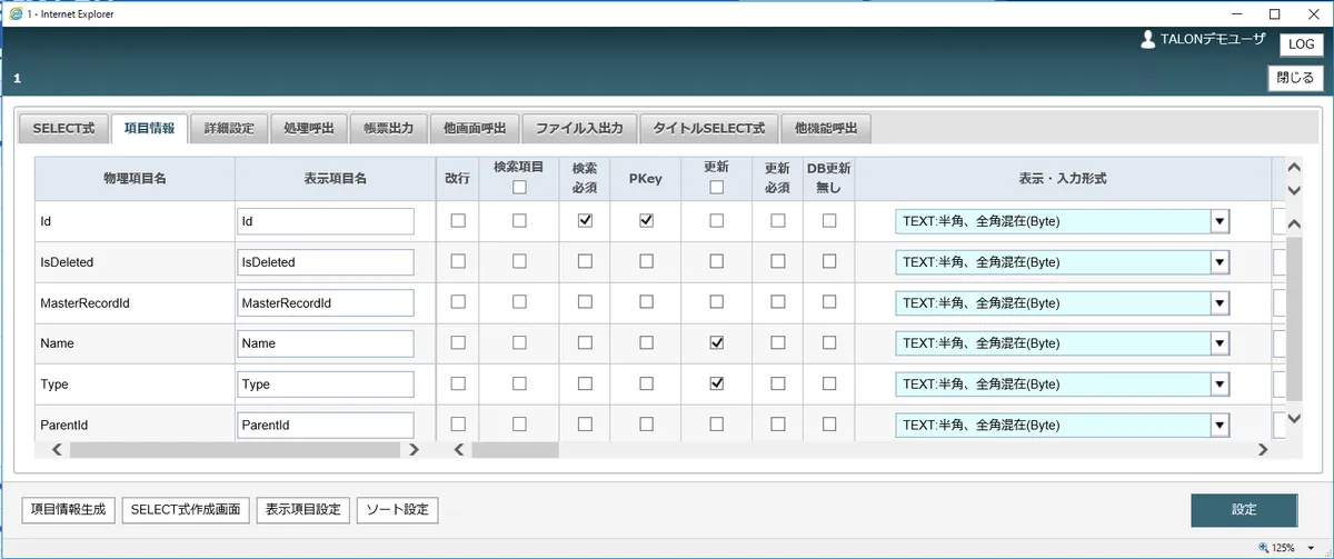 項目情報生成を押下すると、項目情報に値がセットされます。ここではさまざまな条件を各画面項目に対して設定することができます。