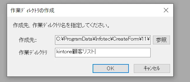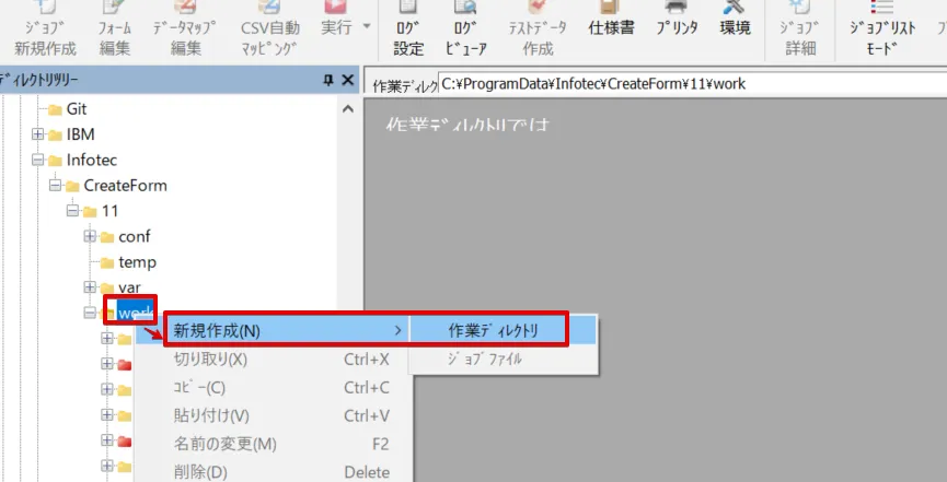 - Infotec → CreateForm → 11 → work 上で右クリックし、新規作成 → 作業ディレクトリと進みます。