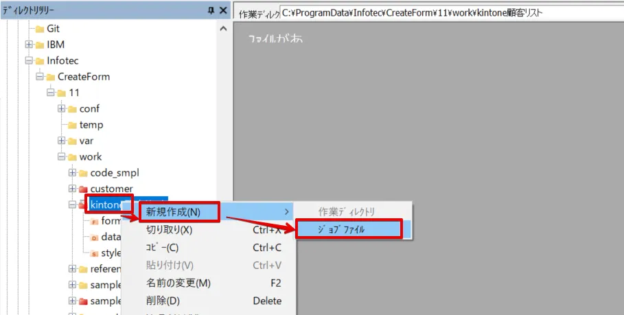 - 対象の作業ディレクトリを選択し、右クリック → 新規作成 → ジョブファイルと進みます。