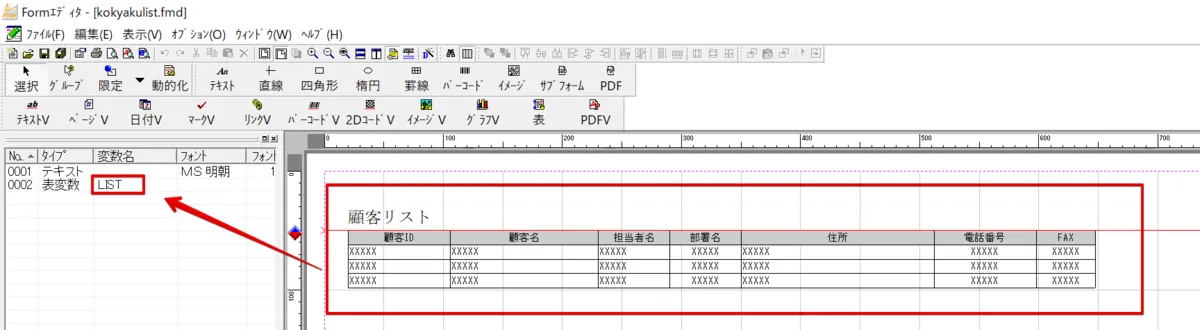 - 今回は以下のようなリストを表示する帳票にしています。左側にあるエリアは変数名の一覧になり、この帳票では表を入れているので、LISTという名前で表型の変数が定義されています。変数は次のデータマッピングで使用します。