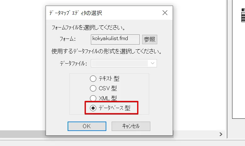 - 使用するデータの形式を設定します。ODBC 経由ですので、データベース型を選択してOK ボタンをクリックします。