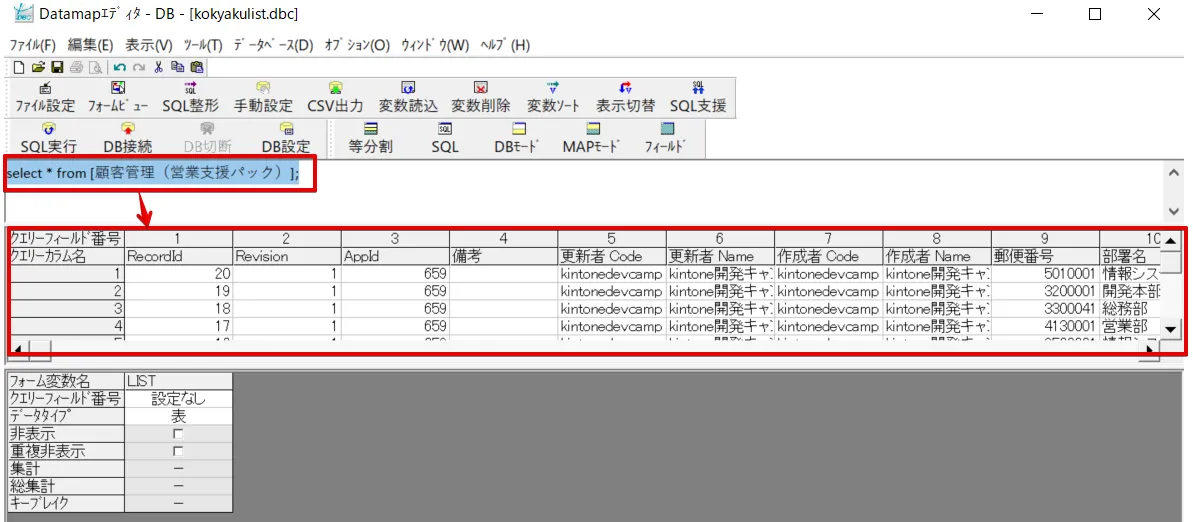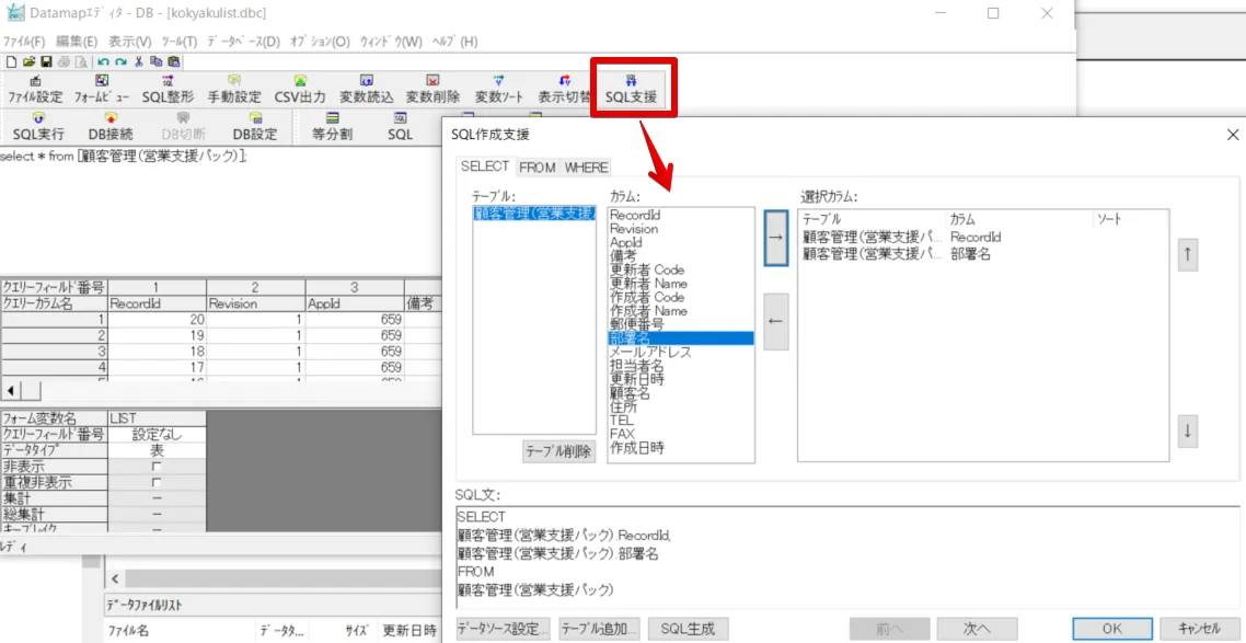 - ちなみに、SQL 支援というボタンをクリックすると、選択式でSQL を組み立てることができます。