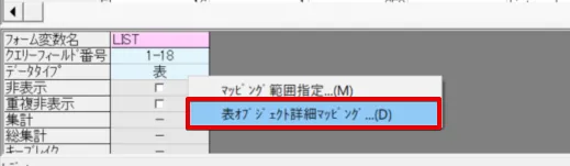 - ここから実際に取得したデータセットと帳票をマッピングしていきますので、画面下部のエリア(フィールドエリア)にて右クリックし、表オブジェクト詳細マッピングを選択します。