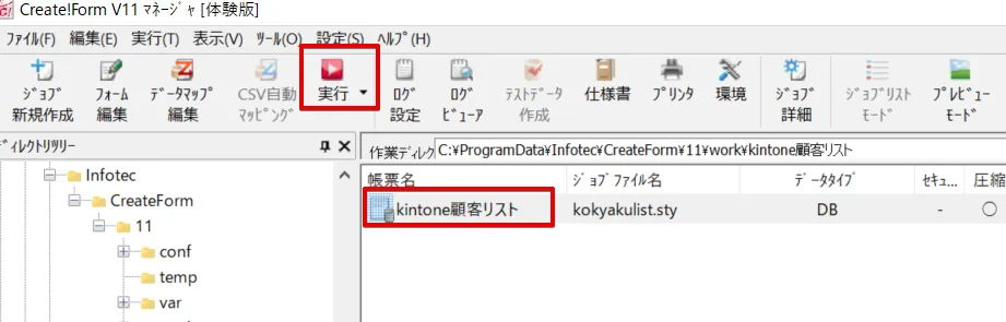 - 作成した帳票を選択した状態で実行ボタンをクリックします。
