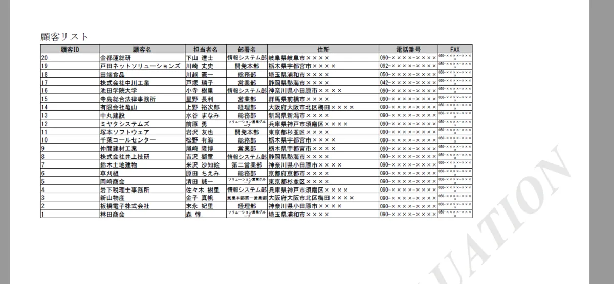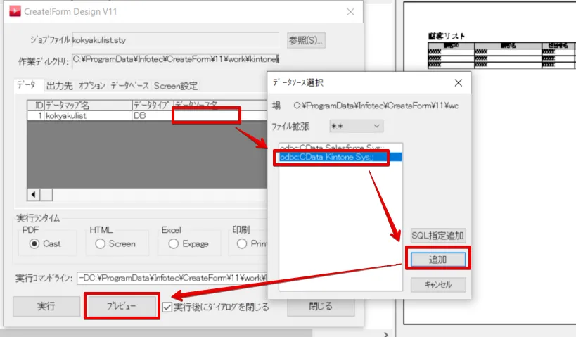 - データソース名をダブルクリックし、プレビューで使用するデータソースを選択します。選択後、プレビューボタンをクリックしてPDF を出力します。