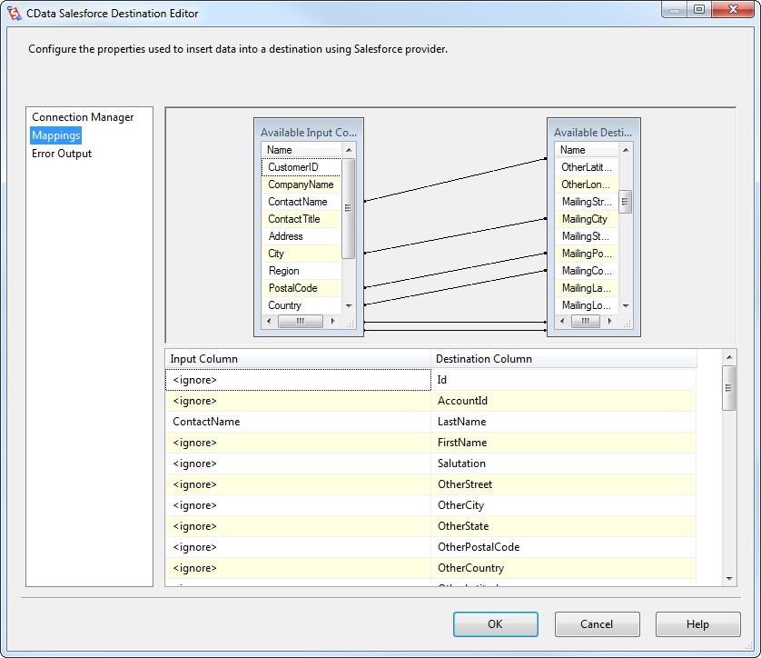 Column Mappings タブで、入力カラムからデスティネーションカラムへのマッピングを設定します。