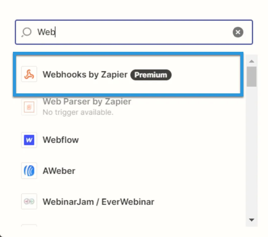 - 表示されるダイアログで「Webhooks by Zapier」を検索し、下に表示されるオプションをクリックします。