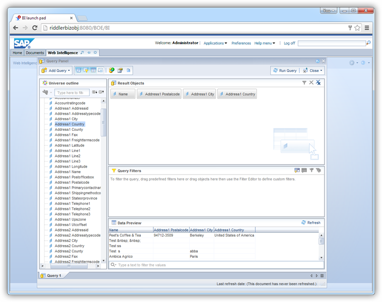 - BusinessObjects ランチパッドから Web Intelligence を開き、新しいドキュメントを作成します。
