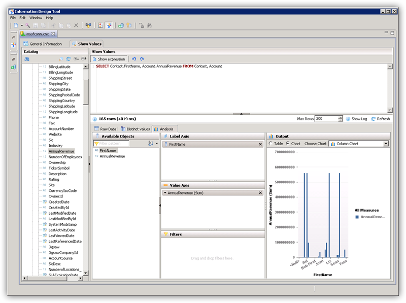 - Analysis タブでは、カラムをチャートの軸にドラッグ&ドロップしてデータを分析できます。