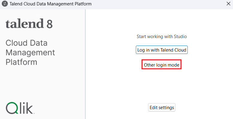 - ローカルシステムにインストールされている Talend Cloud Data Management Platform を起動し、Other Login Mode をクリックします。