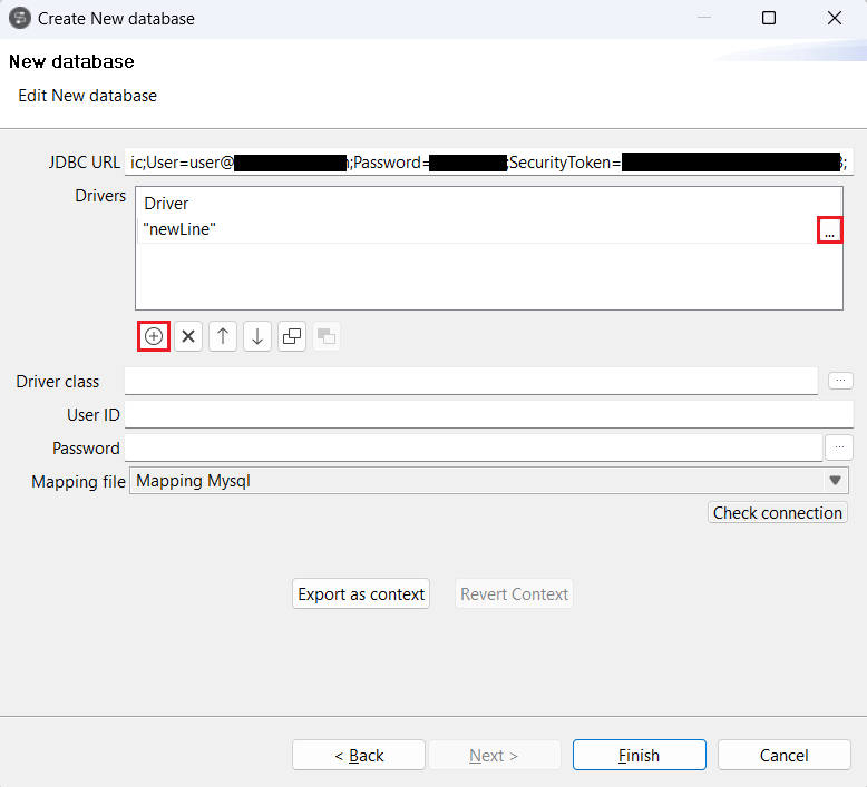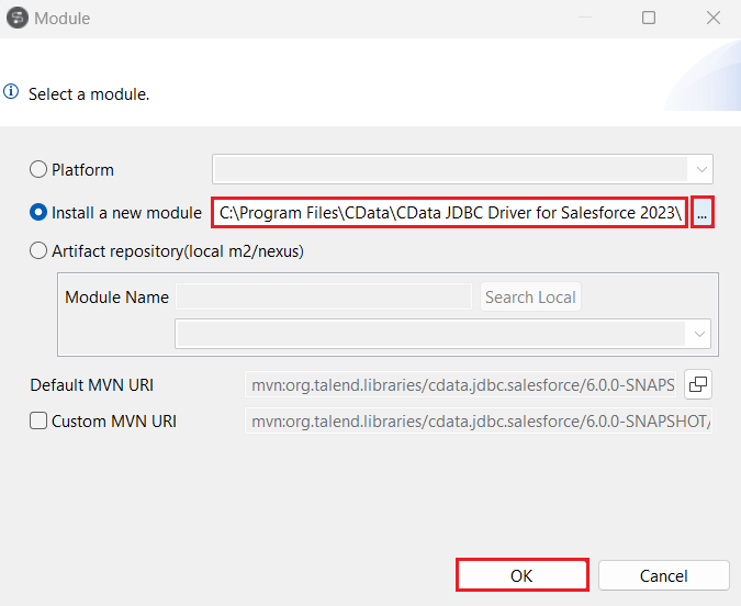 - Drivers の下にある「(+) Add」ボタンをクリックします。Drivers ボードに「newLine」が表示されます。新しい行の末尾にある (...) をクリックし、Install a new module ラジオボタンを選択して、(...) をクリックしてインストールディレクトリの「lib」サブフォルダにある JAR ファイルへのパスを追加します。OK をクリックします。