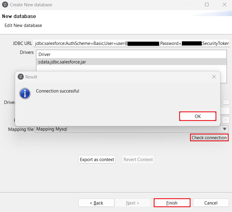 - Check Connection をクリックします。入力した詳細が正しければ、「Connection successful」という確認プロンプトが表示されます。「OK」と「Finish」をクリックします。