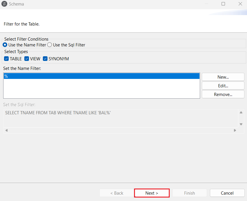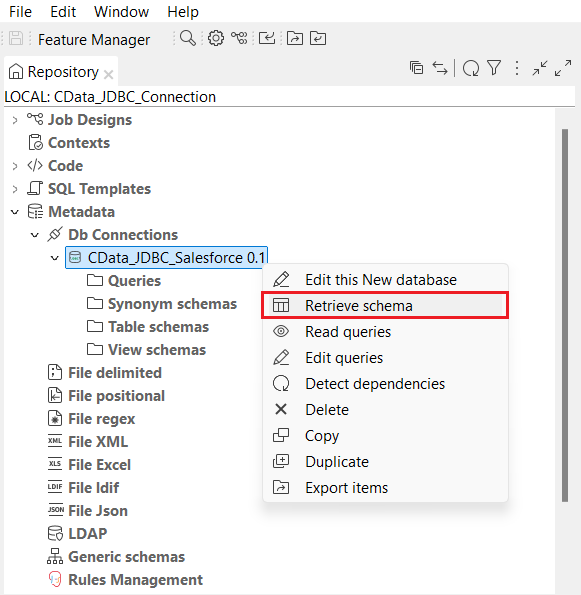 - 接続が確立されたら、新しく作成した接続を右クリックし、Retrieve Schema を選択します。フィルターを使用して必要なデータを取得することもできます。Next をクリックします。