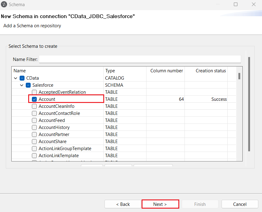- Schema ウィンドウで「CData」カタログを展開し、GitHub スキーマからインポートするテーブルを選択します。Next をクリックします。