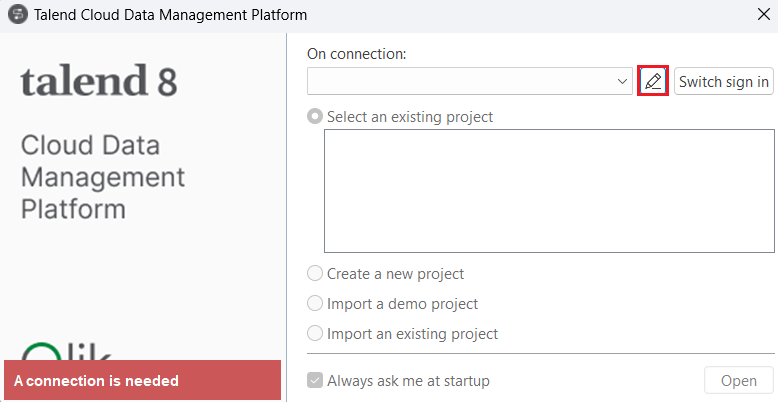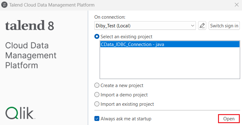 - 新しいプロジェクトが Select an existing project セクションに表示されます。Open をクリックします。Talend Cloud Data Management Platform ワークスペースが開きます。