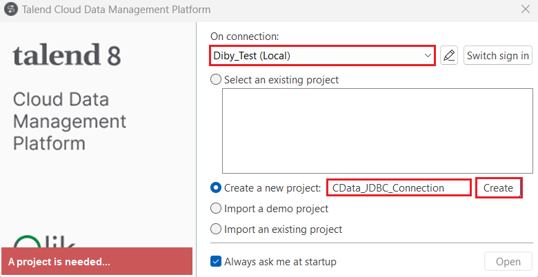 - Create a new project ラジオボタンを選択して新しいプロジェクト名を追加し、Create をクリックします。