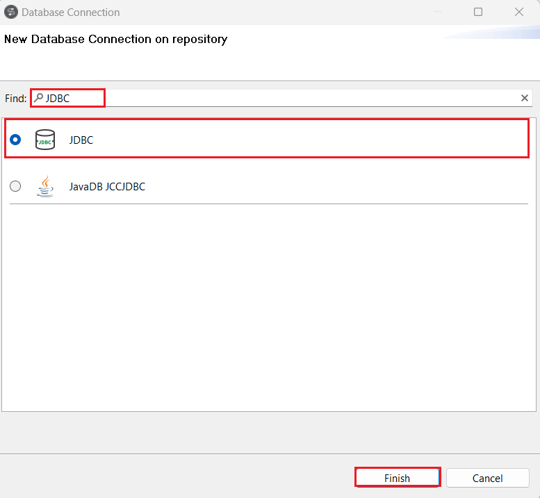 - Database Connection ウィンドウの Find セクションで「JDBC」を検索して選択します。次に、Finish をクリックします。